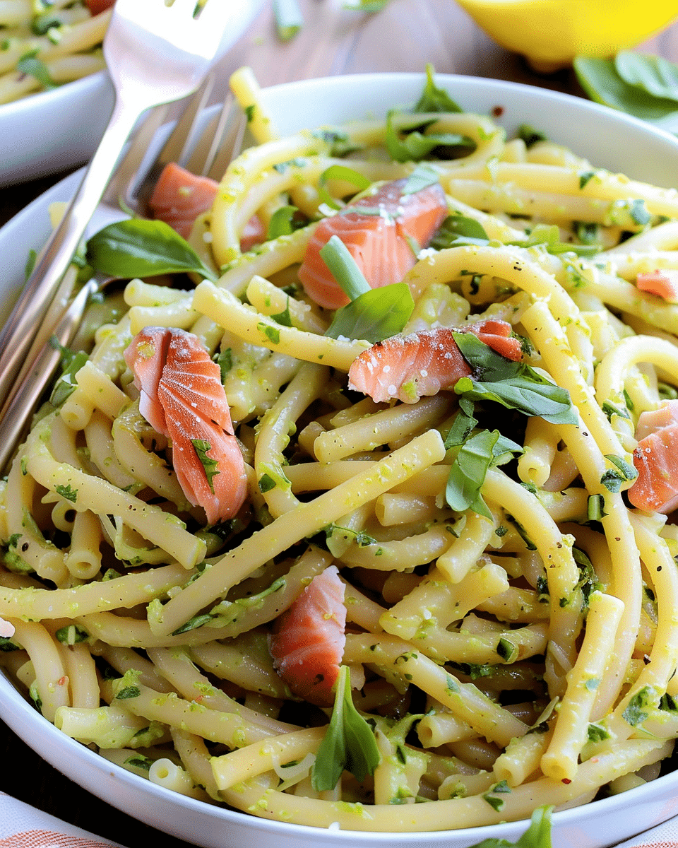 Salmon pesto pasta is a Mediterranean-inspired dish combining flaked salmon, penne, sun-dried tomatoes, artichoke hearts, and arugula in a creamy basil pesto sauce. Ready in 30 minutes, it’s flavorful, nutritious, and ideal for weeknights or entertaining.