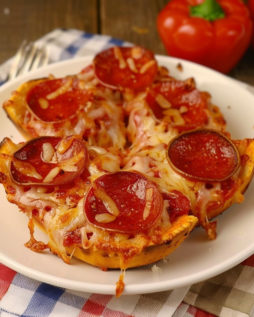 A quick and lighter pizza-inspired appetizer made with mini bell peppers filled with marinara, melted mozzarella, and turkey pepperoni for a colorful, crowd-pleasing bite.