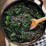 These black lentils with spinach are tender, earthy, and deeply flavorful, tossed with lightly caramelized onions and reduced balsamic vinegar. Served over creamy labneh or lemony yogurt, this nourishing vegetarian dish is perfect for weeknights or meal prep.