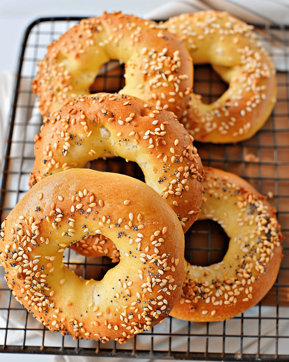 Store the bagels in an airtight container in the refrigerator for up to 5 days. For longer storage, slice and freeze them for up to 2 months. To reheat, toast directly from the fridge or freezer, or warm in a preheated oven at 160°C (325°F) for a few minutes until heated through.