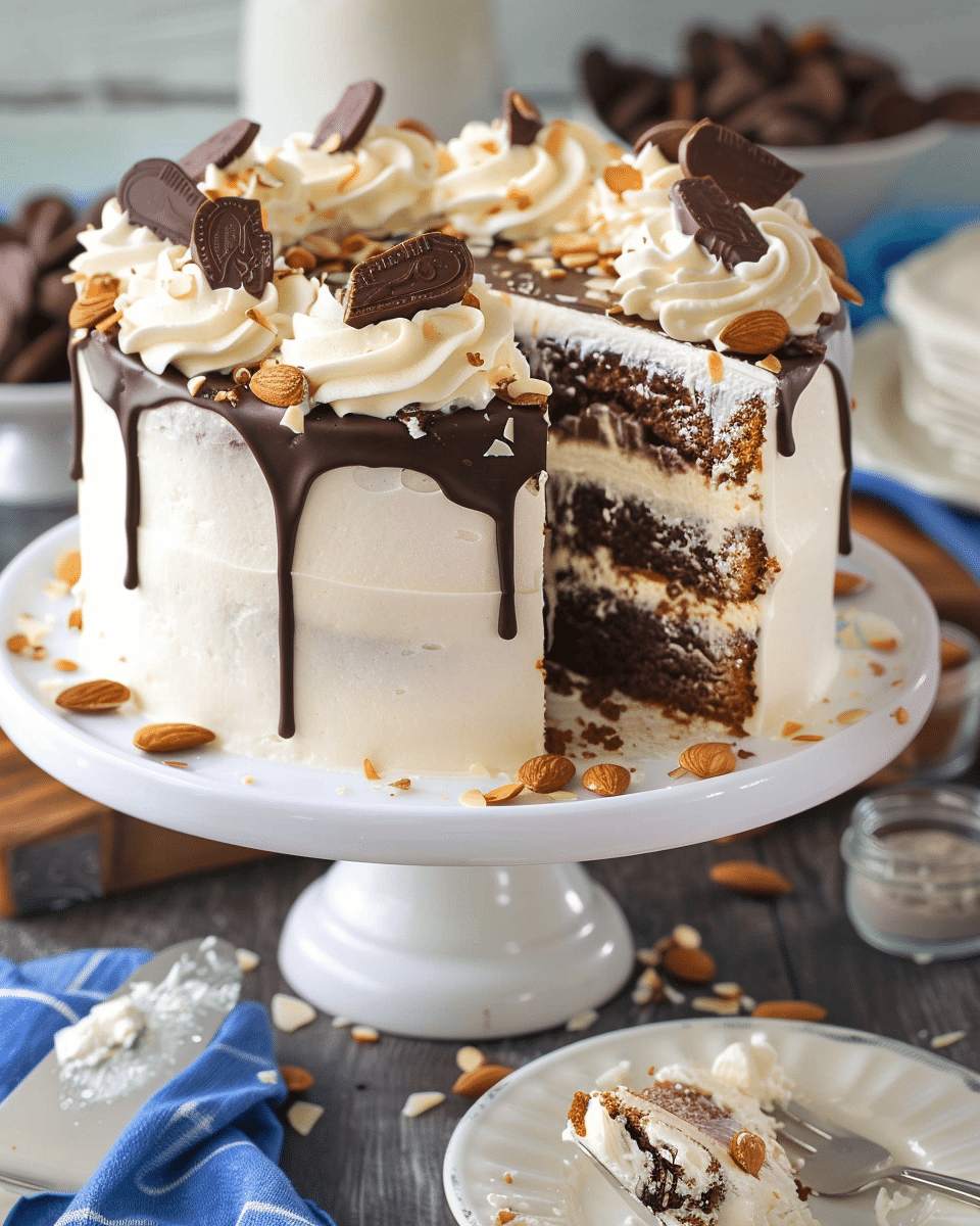 This Almond Joy Layer Cake is a rich and indulgent dessert inspired by the classic candy bar, featuring moist chocolate cake layers, chewy coconut filling, almond slivers, coconut frosting, and a smooth chocolate ganache topping—perfect for special occasions.