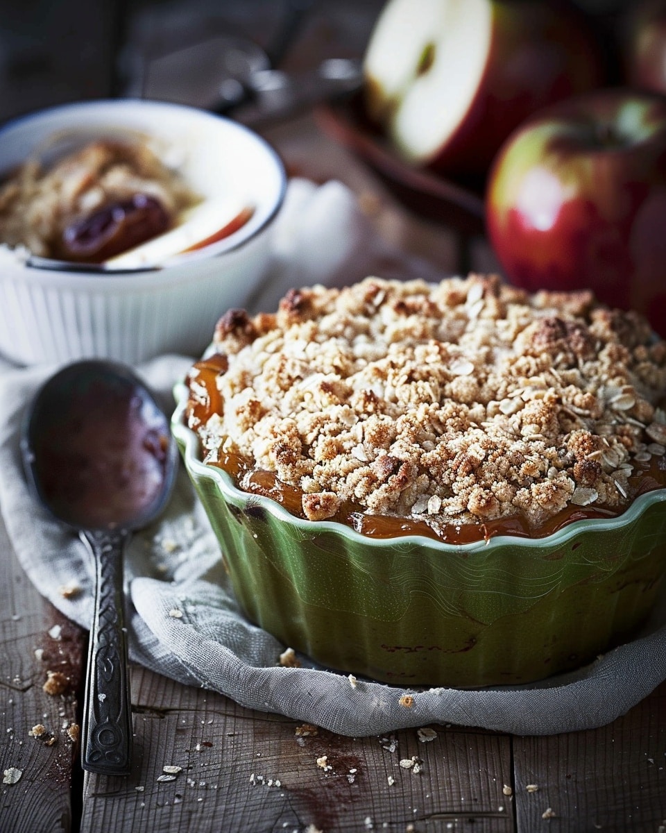 A warm and comforting apple date crumble that combines tender baked apples with naturally sweet dates and a crisp, buttery topping. This dessert is perfect for cozy evenings and brings together simple ingredients for a rich, satisfying treat.
