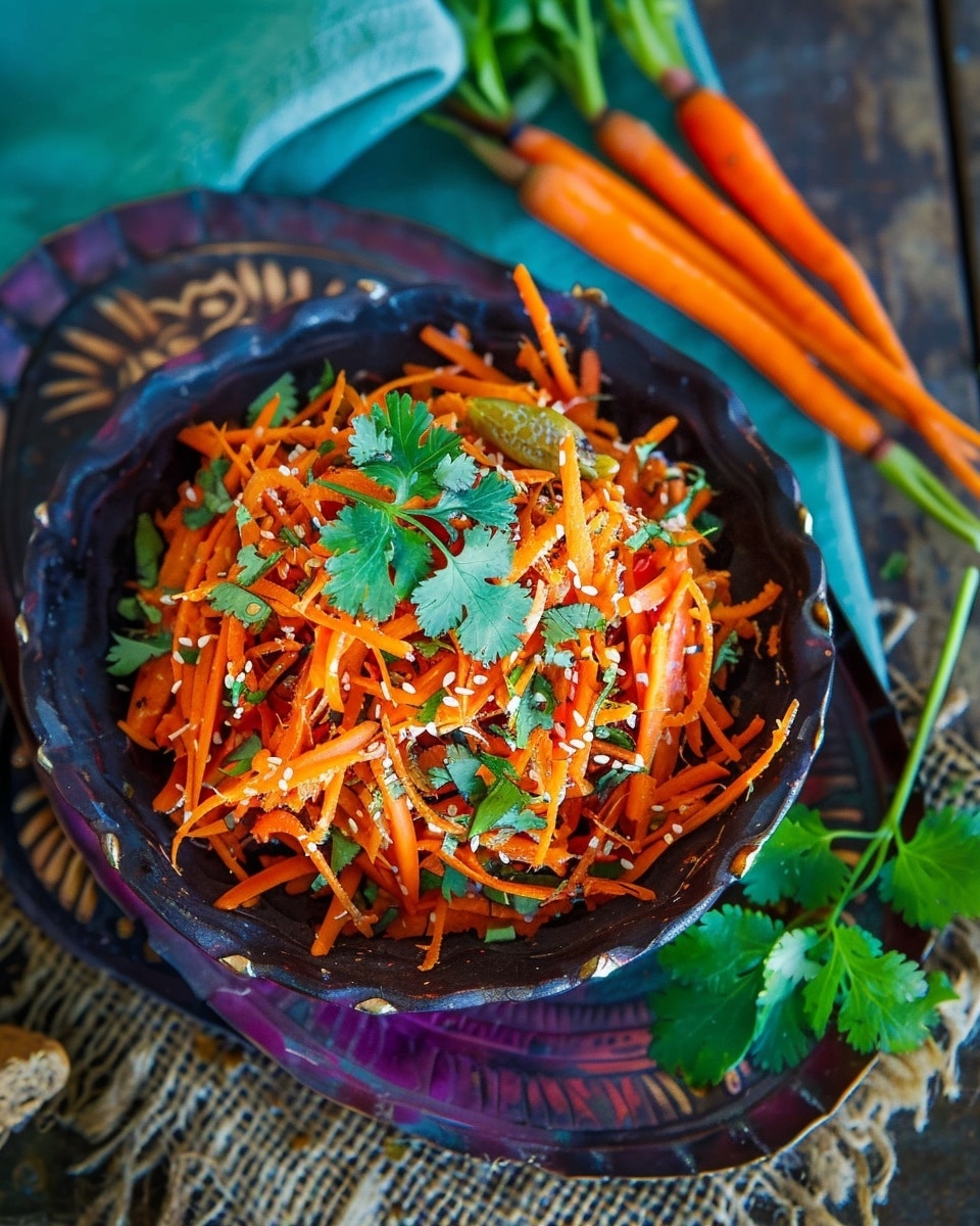 A crisp and refreshing carrot salad tossed with fresh herbs and a tangy Asian-inspired dressing, delivering a perfect balance of sweet, savory, and zesty flavors.