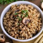 Baked barley with mushrooms is a warm and comforting dish where tender pearled barley bakes in a savory blend of mushrooms, garlic, butter, and vegetable broth. The result is a hearty grain side with rich earthy flavor and a pleasantly chewy texture.