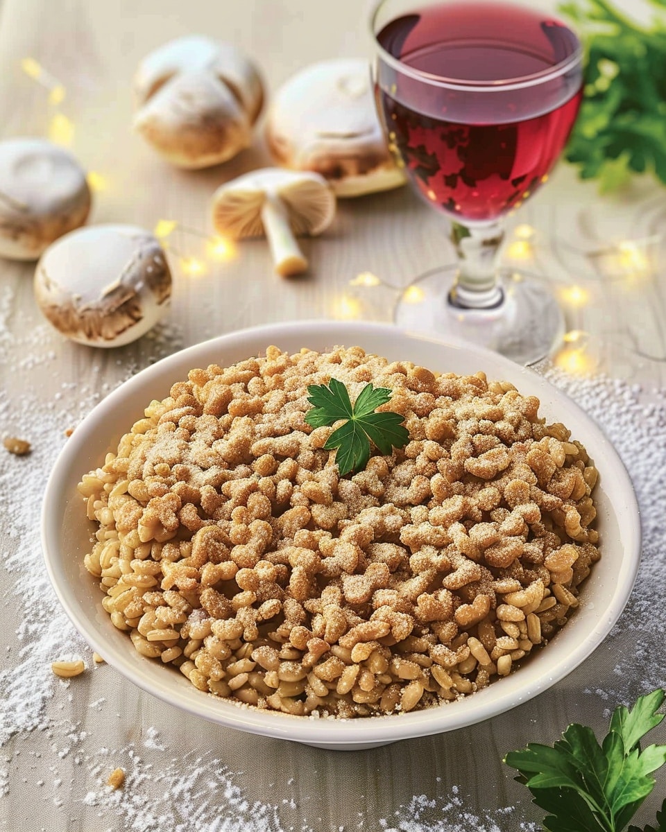 Baked Barley with Mushrooms is a warm and comforting side dish made with tender pearled barley baked in a savory mixture of mushrooms, garlic, butter, and vegetable broth. The oven does most of the work, allowing the barley to slowly absorb all the rich flavors while developing a soft yet pleasantly chewy texture. This hearty grain dish pairs beautifully with roasted meats, stews, or simple vegetable plates, making it a cozy addition to any meal.