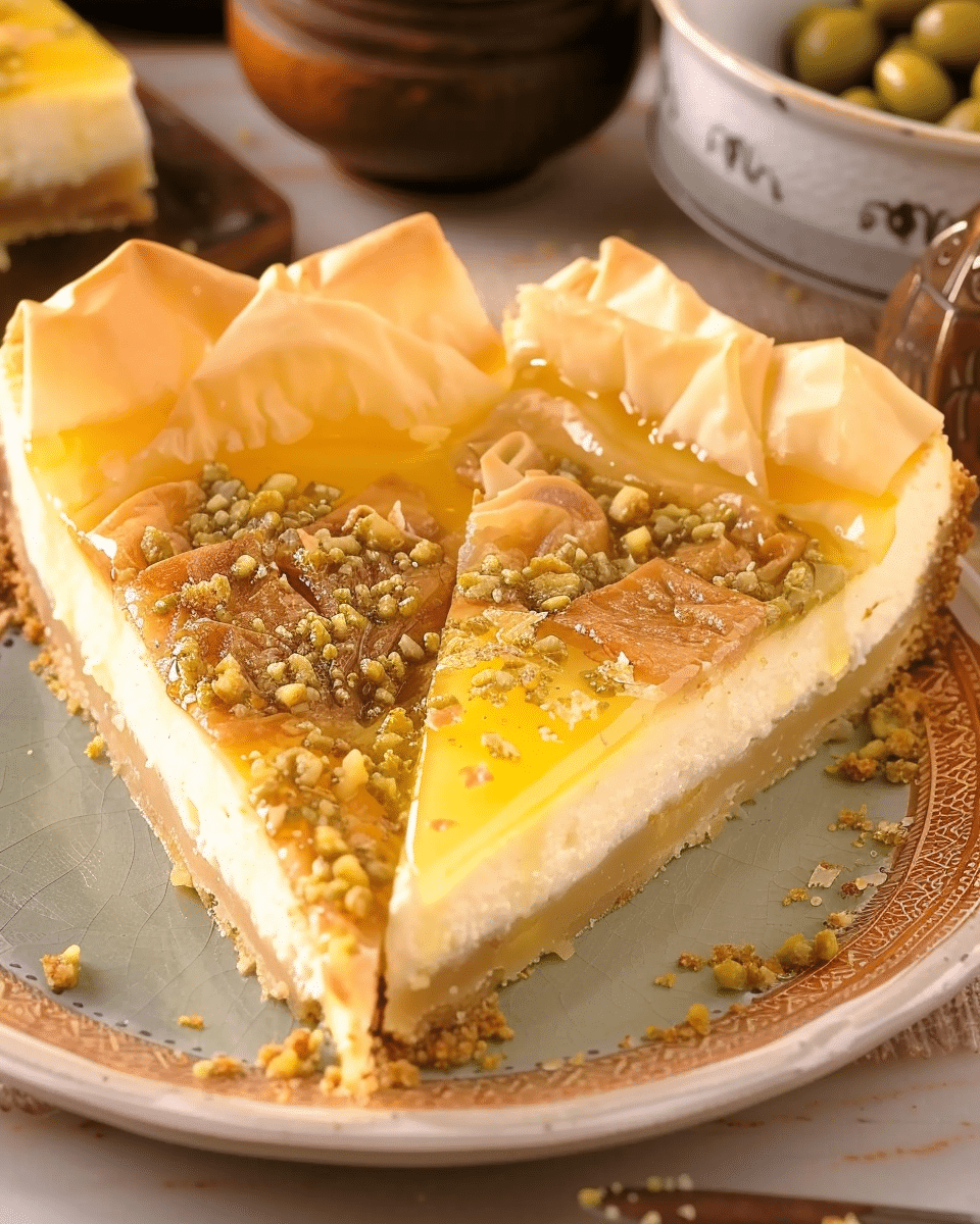 This baklava cheesecake brings together two iconic desserts in one unforgettable creation. A creamy, tangy cheesecake filling sits on a crisp, buttery phyllo crust, finished with a fragrant honey, rose water, and nut topping. Every bite delivers contrast in texture and flavor, from flaky and crunchy to smooth and rich.