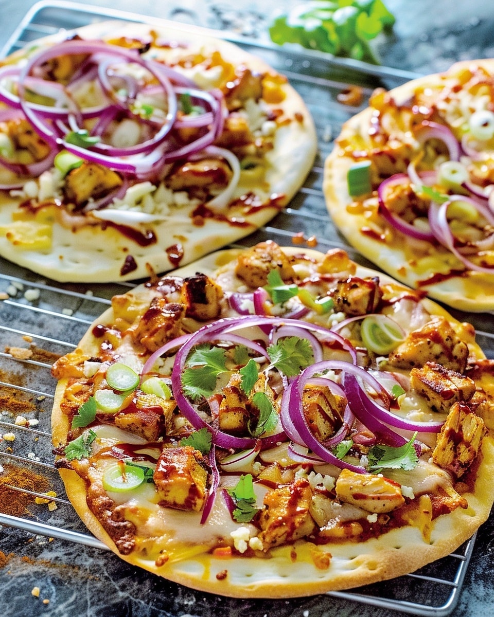 Top the flatbreads with the barbecue chicken, then scatter the sliced red onion over everything. Add jalapeños if you want extra heat.