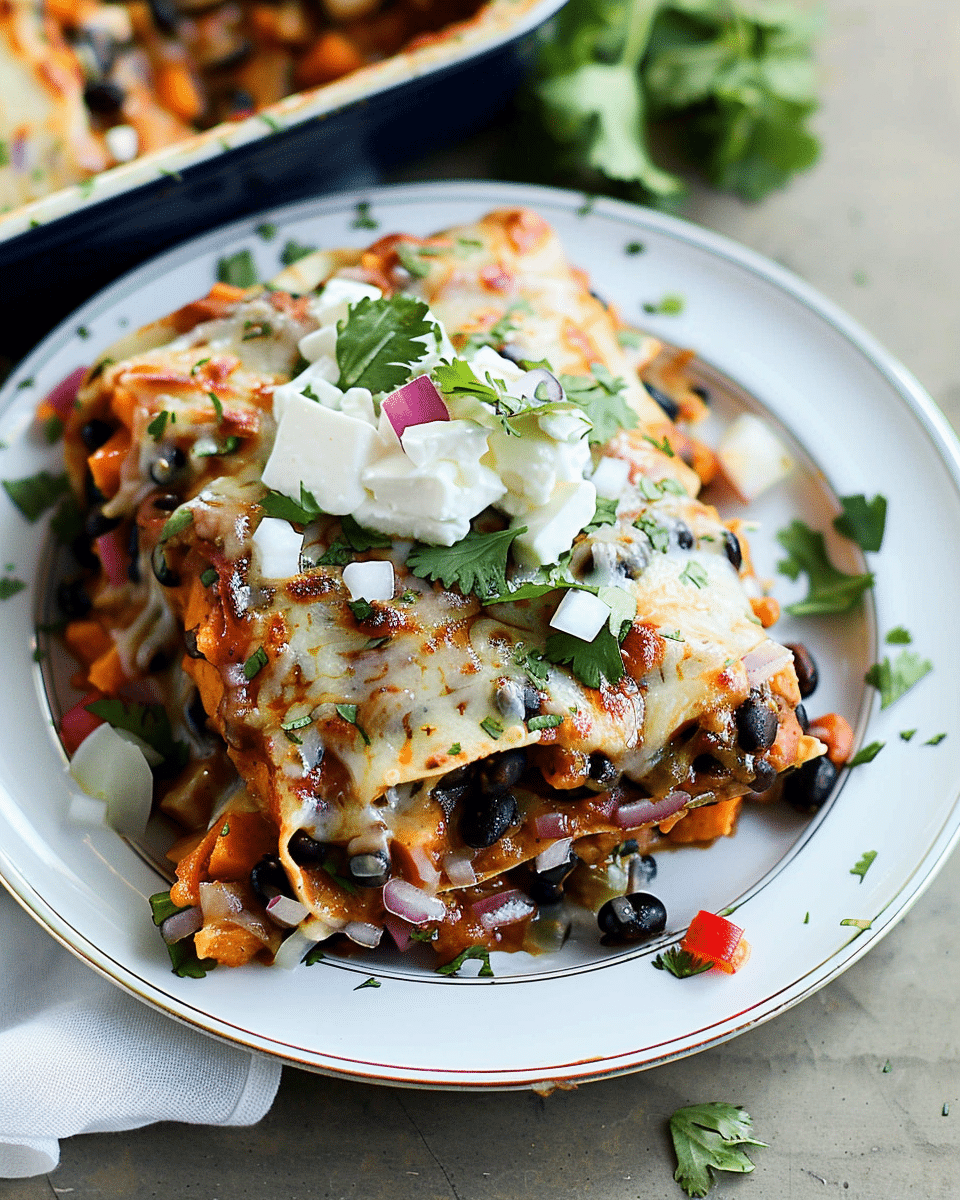 These Black Bean Sweet Potato Enchiladas are a perfect fusion of comfort and nutrition, offering a satisfying meal for vegetarians and meat-eaters alike. With simple ingredients, bold flavors, and easy prep, they’re an ideal dish for weeknights or entertaining. Serve them fresh out of the oven for a wholesome, crowd-pleasing dinner.