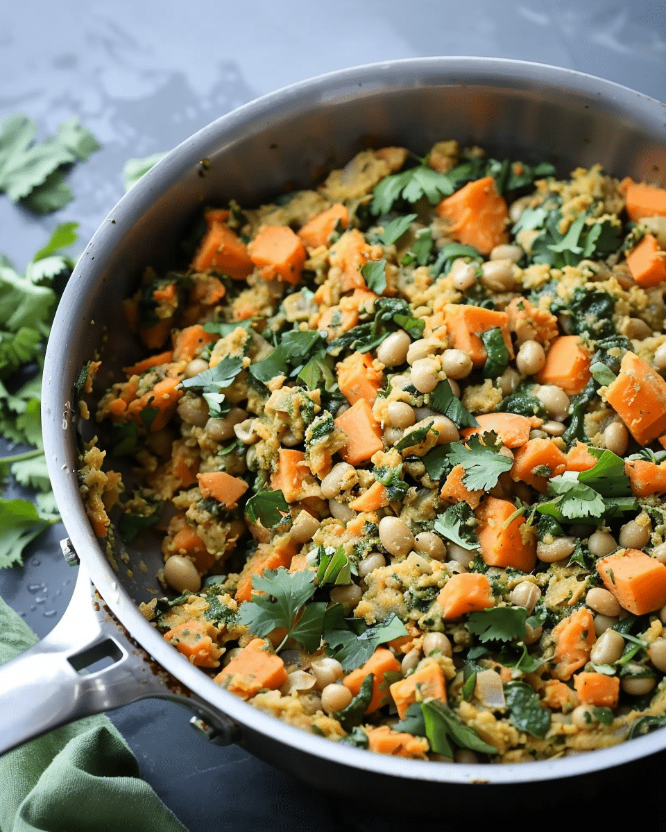 A hearty, colorful one-pan hash made with tender sweet potatoes, protein-rich black eyed peas, warming spices, and fresh greens. This satisfying vegan dish comes together quickly and works just as well for breakfast, brunch, or a simple weeknight meal served over toast or grains.