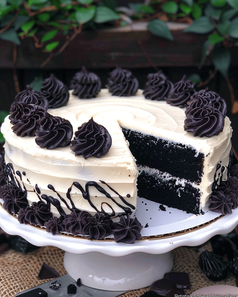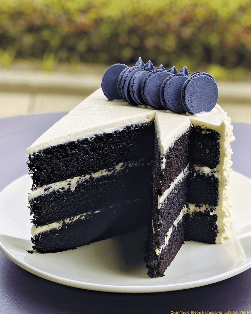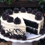 This Black Velvet Cake is a dramatic and elegant twist on the classic red velvet. Instead of red food coloring, it uses black cocoa powder to give the cake its deep, dark color. The texture is soft and velvety thanks to a unique addition of cream cheese in the batter, which adds richness without overwhelming flavor. The cake is layered with a light whipped cream filling (with optional crushed Oreos) and finished with a smooth vanilla buttercream, creating a perfect contrast between bold appearance and balanced taste.