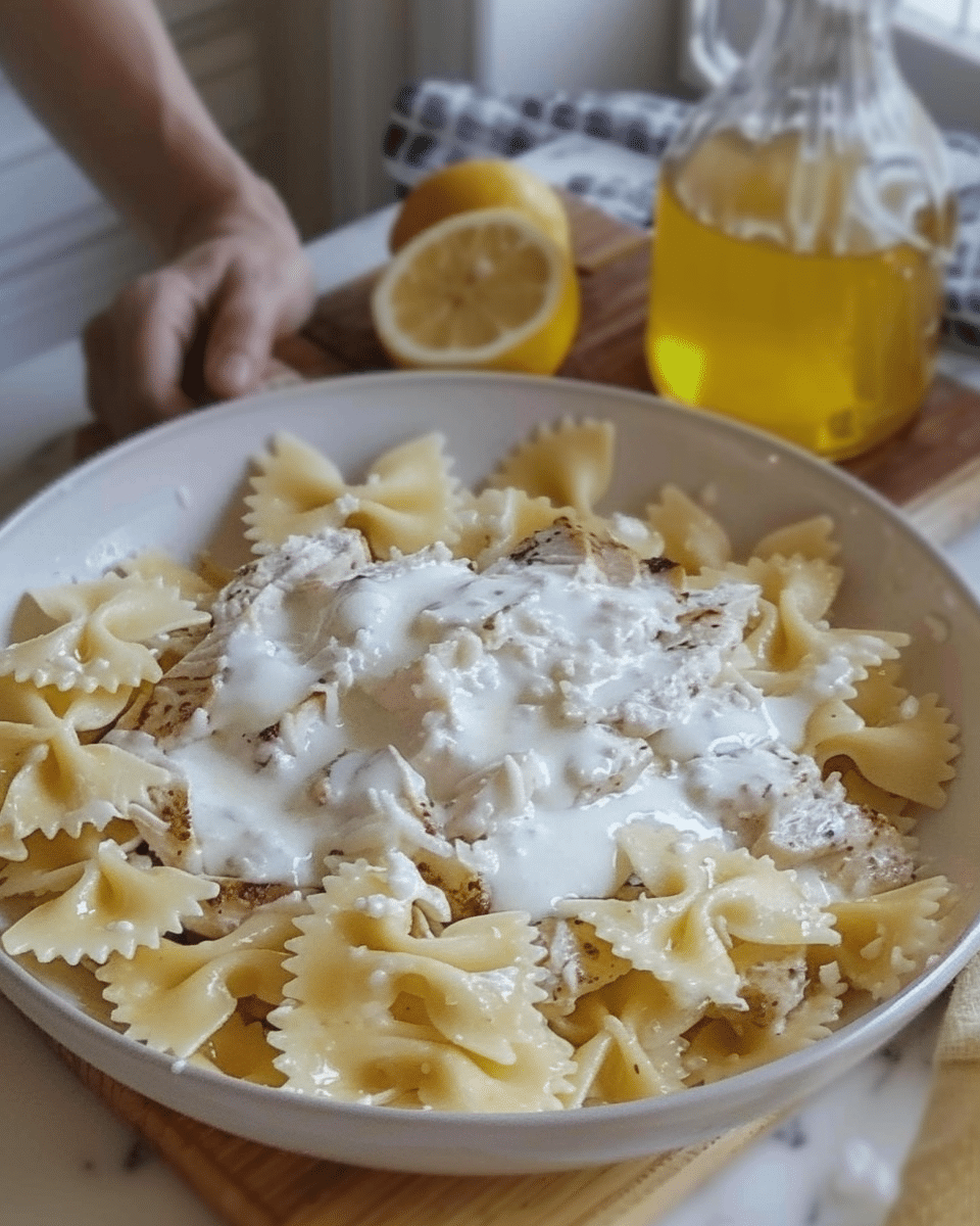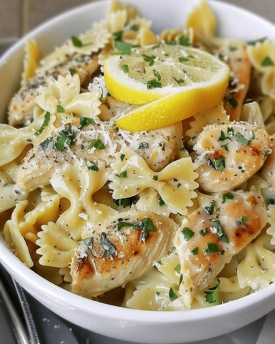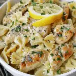 Bowtie Lemon Garlic Chicken Pasta is a creamy, citrusy pasta dish made with tender chicken, farfalle pasta, and a rich garlic-lemon cream sauce finished with Parmesan. It’s a comforting yet fresh meal perfect for both weeknights and special occasions.