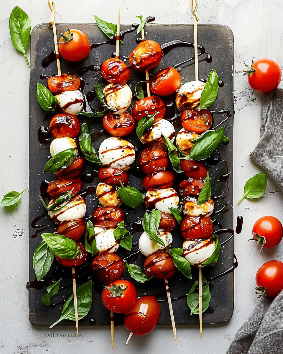 Caprese Skewers with Balsamic Drizzle are a fresh, no-cook appetizer featuring cherry tomatoes, mozzarella balls, and basil leaves skewered together and topped with a tangy-sweet balsamic reduction. They’re elegant, simple, and perfect for entertaining.