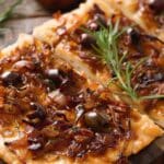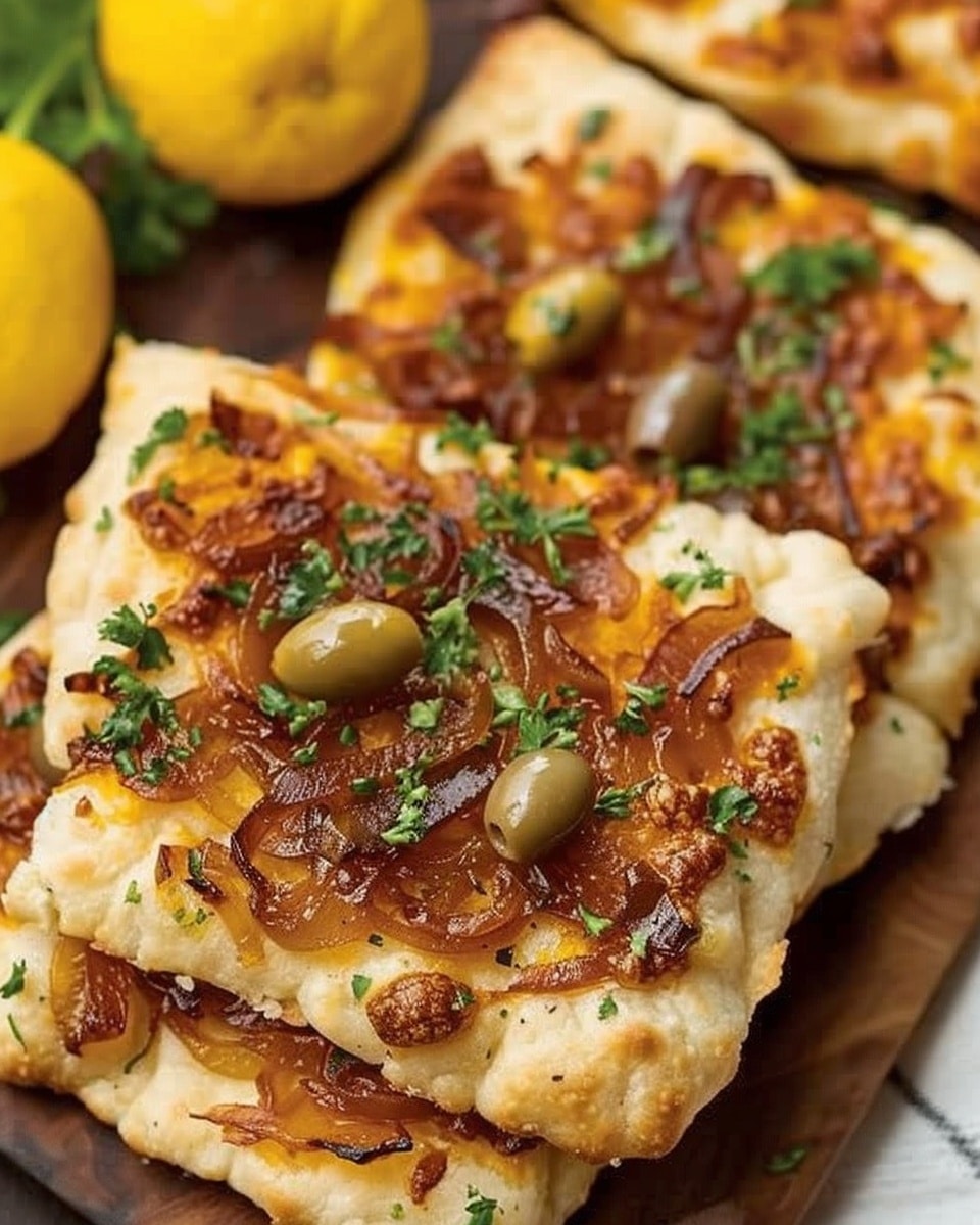 A savory flatbread topped with rich, jammy caramelized onions, briny olives, and fragrant herbs. This Mediterranean-inspired dish is simple, elegant, and full of deep flavor.