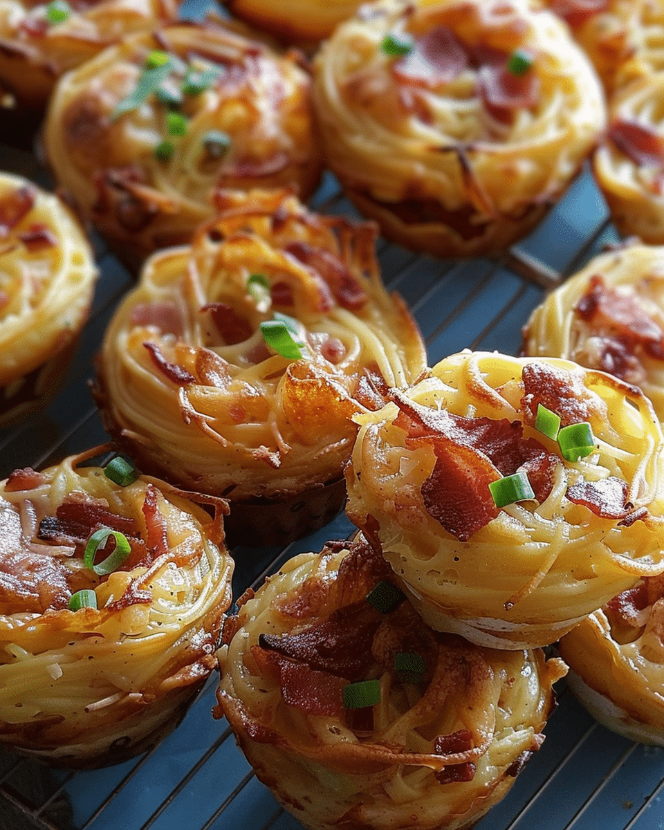 Carbonara muffins are a creative twist on pasta, baked into muffin cups for a fun, portable, and delicious snack or meal. They combine creamy eggs, Parmesan, and spaghetti for a savory handheld treat without any meat.