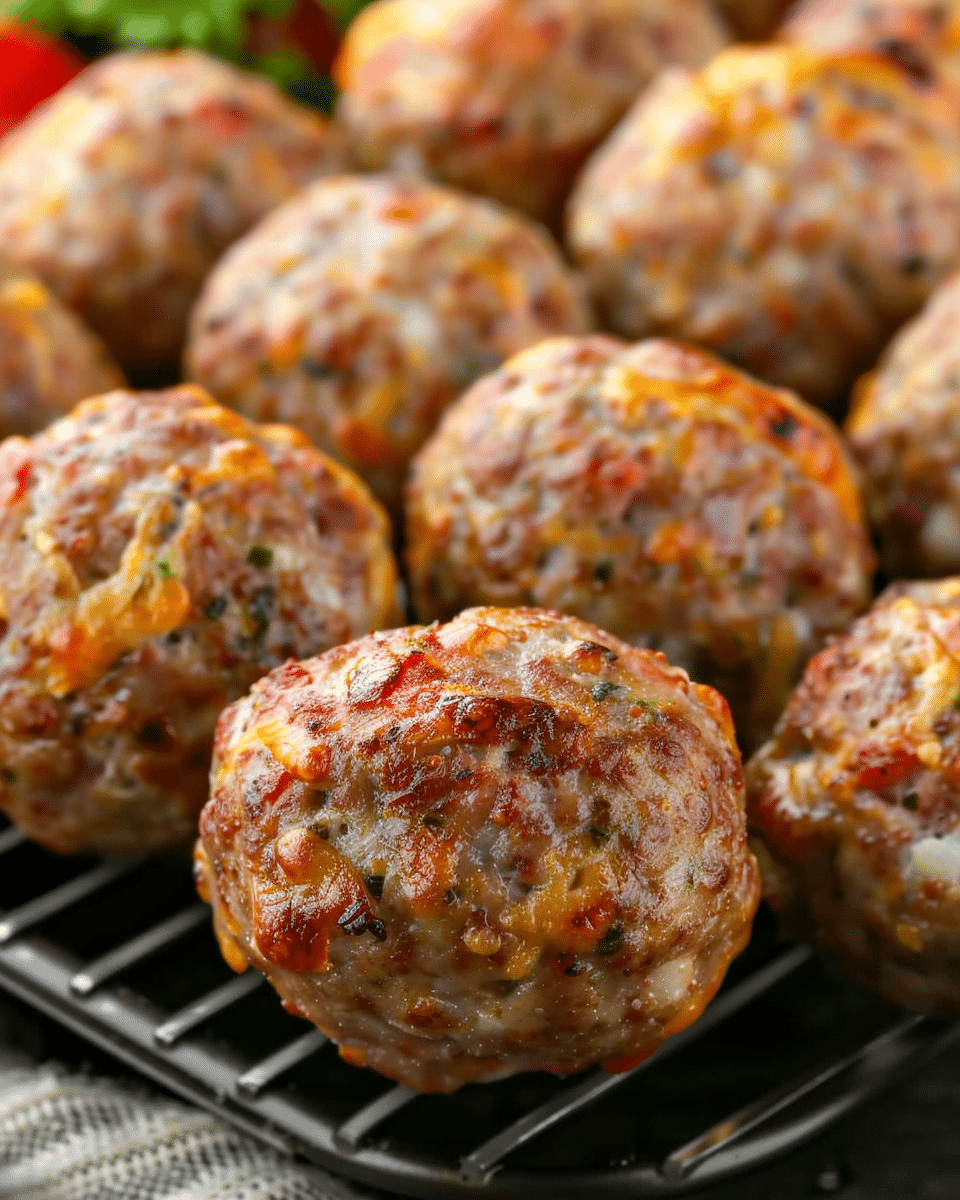Store leftover sausage balls in an airtight container in the refrigerator for up to 4 days. To reheat, warm them in a 350°F (175°C) oven for 8 to 10 minutes until heated through. They can also be reheated in the microwave for about 20 to 30 seconds, though the oven will keep them crispier.