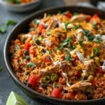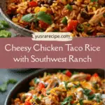 This cheesy chicken taco rice is a comforting one-pan meal packed with bold Southwest flavors. Tender chicken, fluffy rice, zesty tomatoes, and warm spices cook together into a rich, satisfying dish, finished with melted cheese and creamy toppings that make every bite hearty and delicious.