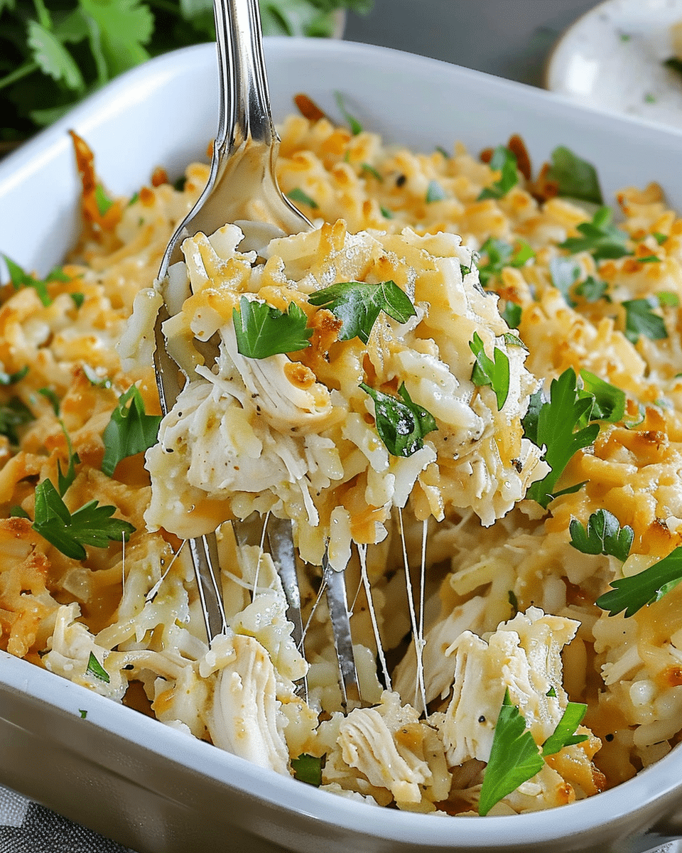 A comforting, creamy chicken and rice casserole made with tender chicken, long-grain rice, savory mushroom soup, and a golden Parmesan crust—perfect for cozy weeknight dinners or meal prep.