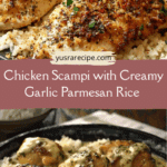 This Chicken Scampi with Creamy Garlic Parmesan Rice is a one-skillet meal featuring golden, seasoned chicken atop rich, lemony garlic-Parmesan rice. It’s cozy, creamy, and full of flavor—perfect for both busy weeknights and special dinners.