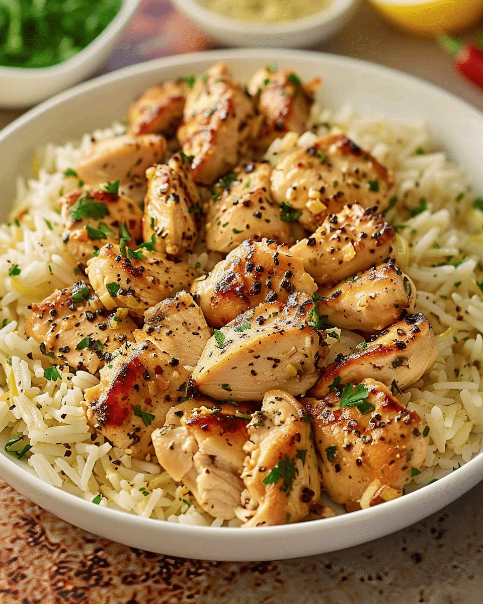 A comforting and flavorful dish featuring tender chicken in a garlic-lemon butter sauce served over creamy garlic Parmesan rice. Elegant enough for guests, yet easy enough for a cozy weeknight dinner.