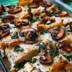 This Chicken, Spinach, and Mushroom Oven Dish is a comforting, cheesy bake featuring tender chicken breasts layered with sautéed mushrooms, spinach, and cream cheese, topped with mozzarella. Perfect for weeknights, meal prep, or family dinners.