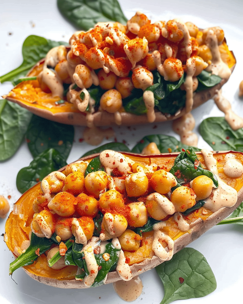 Chickpea Spinach Stuffed Sweet Potatoes are a hearty, comforting vegan meal made with roasted sweet potatoes, crispy spiced chickpeas, garlicky sautéed spinach, and a tahini drizzle. Full of texture and flavor, it’s a wholesome plant-based dish.