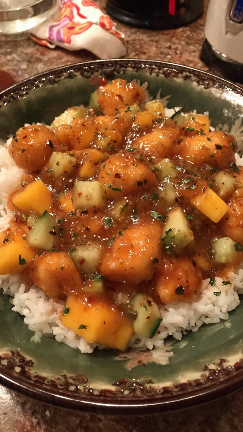 A vibrant and flavor-packed rice bowl featuring crispy Thai curry chicken, a refreshing mango cucumber herb salad, and a rich garlic chili butter drizzle. Perfectly balanced with heat, sweetness, and citrusy brightness.