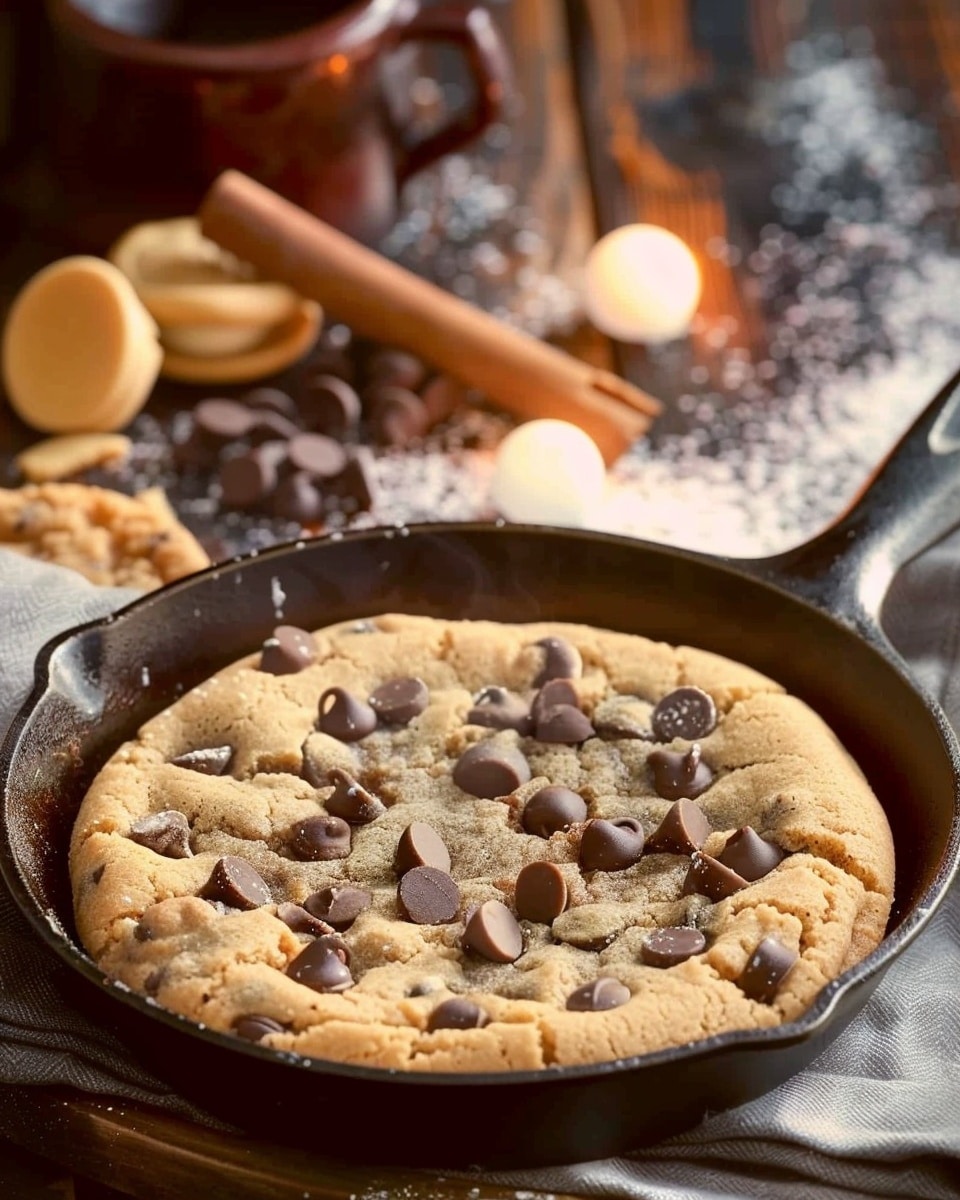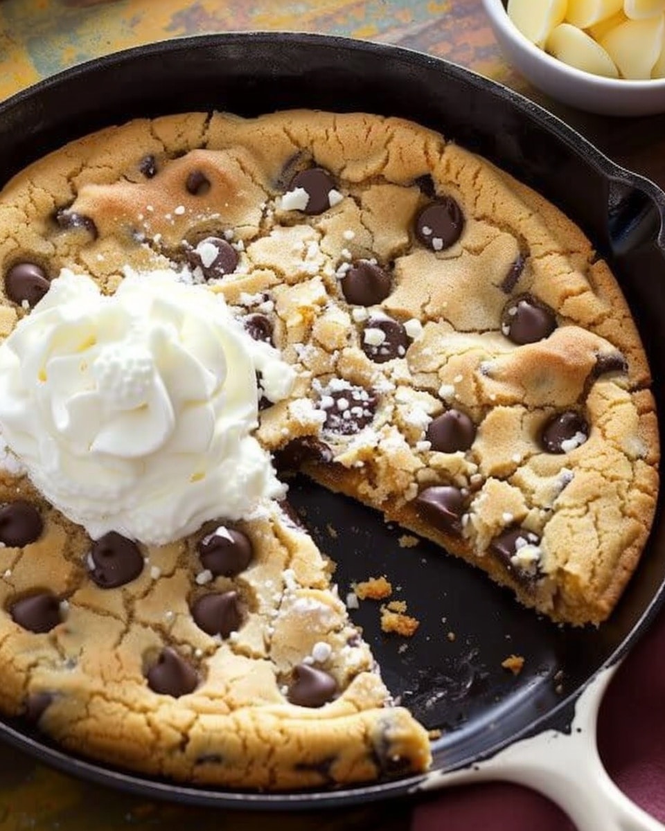 Chocolate Chip Skillet Cookie is a warm, gooey dessert baked in a cast iron skillet with crisp golden edges and a soft, chewy center packed with melted chocolate chips. Perfect for sharing and serving straight from the pan, especially topped with vanilla ice cream.