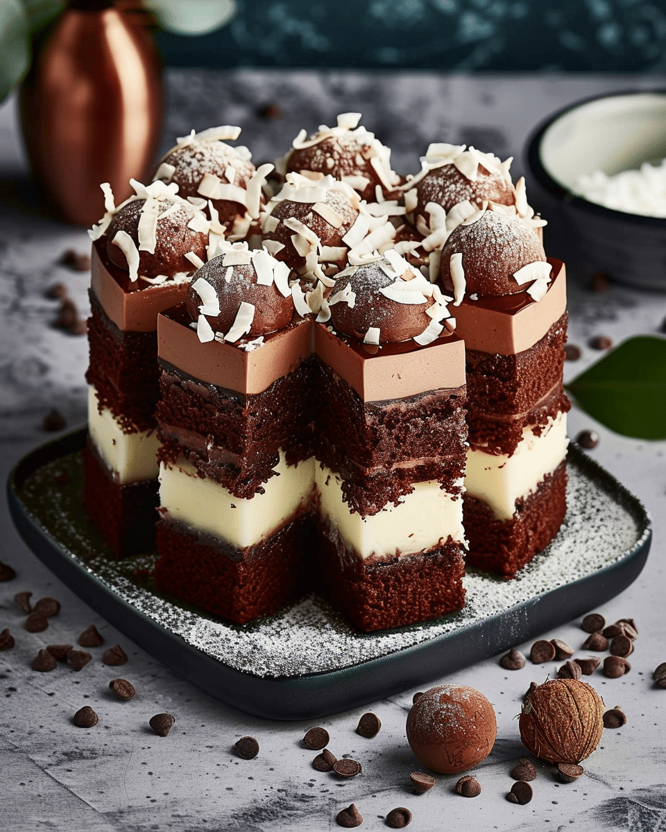 This Chocolate & Coconut Truffle Cake is a rich and indulgent dessert featuring moist chocolate layers, a silky chocolate truffle and coconut cream filling, and a delicate topping of shredded coconut. I love how the bitterness of the dark chocolate pairs perfectly with the sweetness of the coconut. The texture is incredibly soft and creamy, and the cake becomes even more flavorful after chilling overnight. Whether I’m making it for a special celebration or just as a weekend treat, this cake always turns out to be a showstopper.