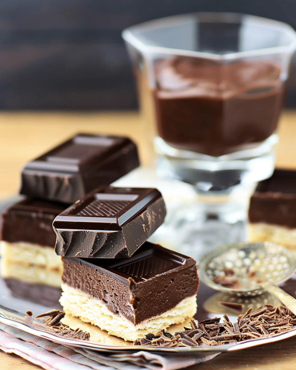 A decadent layered dessert featuring a crisp biscuit base and silky chocolate mousse. This chilled treat combines deep chocolate flavor with a creamy texture and makes an elegant finish to any meal.