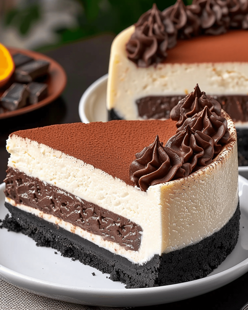 A no-bake cheesecake that combines the richness of dark chocolate with the brightness of orange, layered over a chocolate cookie crust. Creamy, zesty, and indulgent — perfect for any occasion.