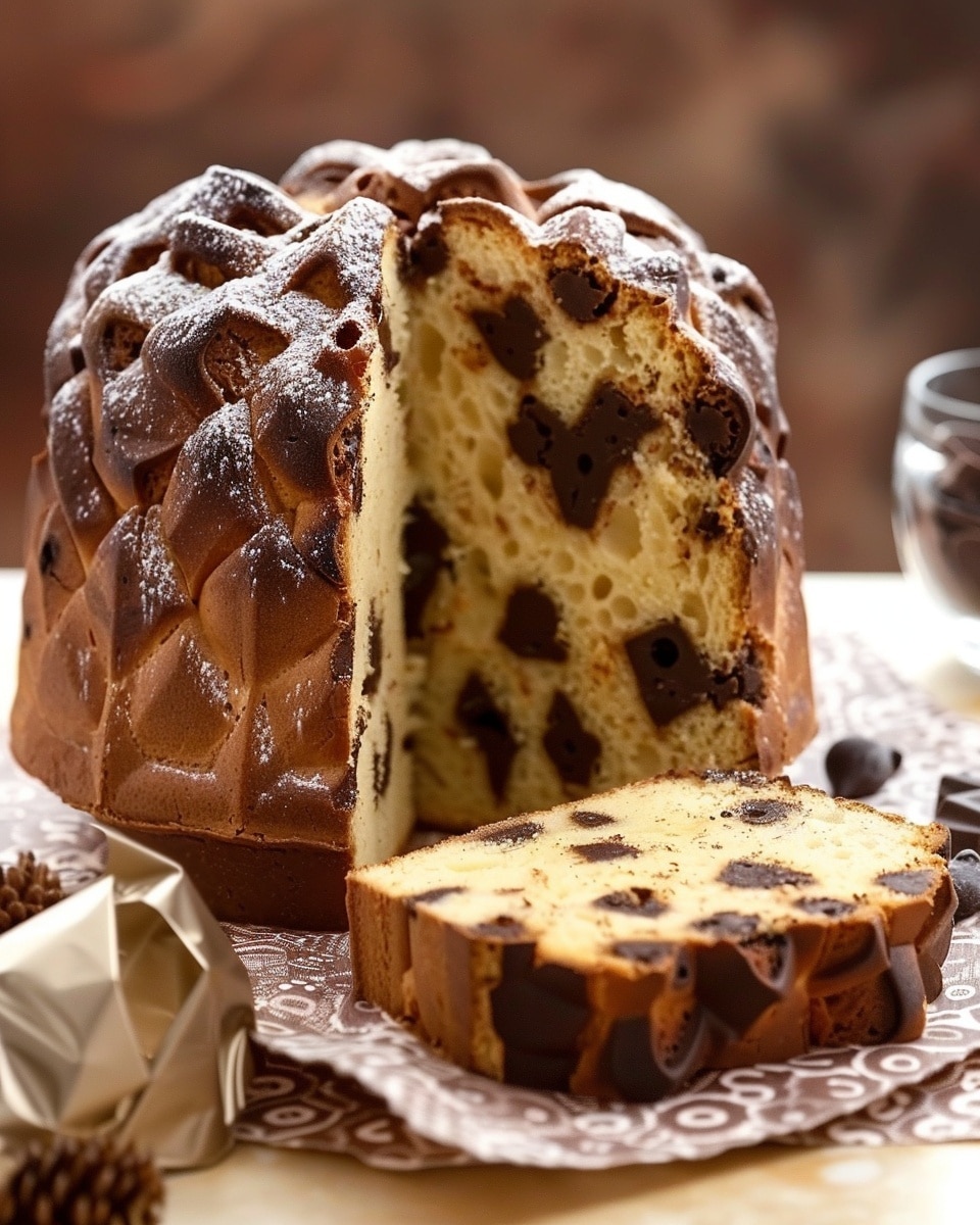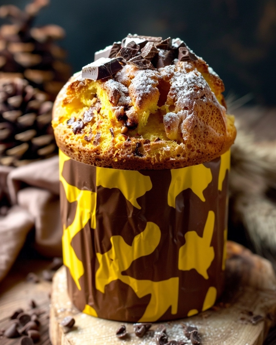 A soft, airy Italian holiday bread enriched with butter and eggs, studded with rich chocolate pieces. This homemade chocolate panettone has a delicate crumb and a slightly sweet flavor, perfect for festive gatherings or a cozy treat with coffee.