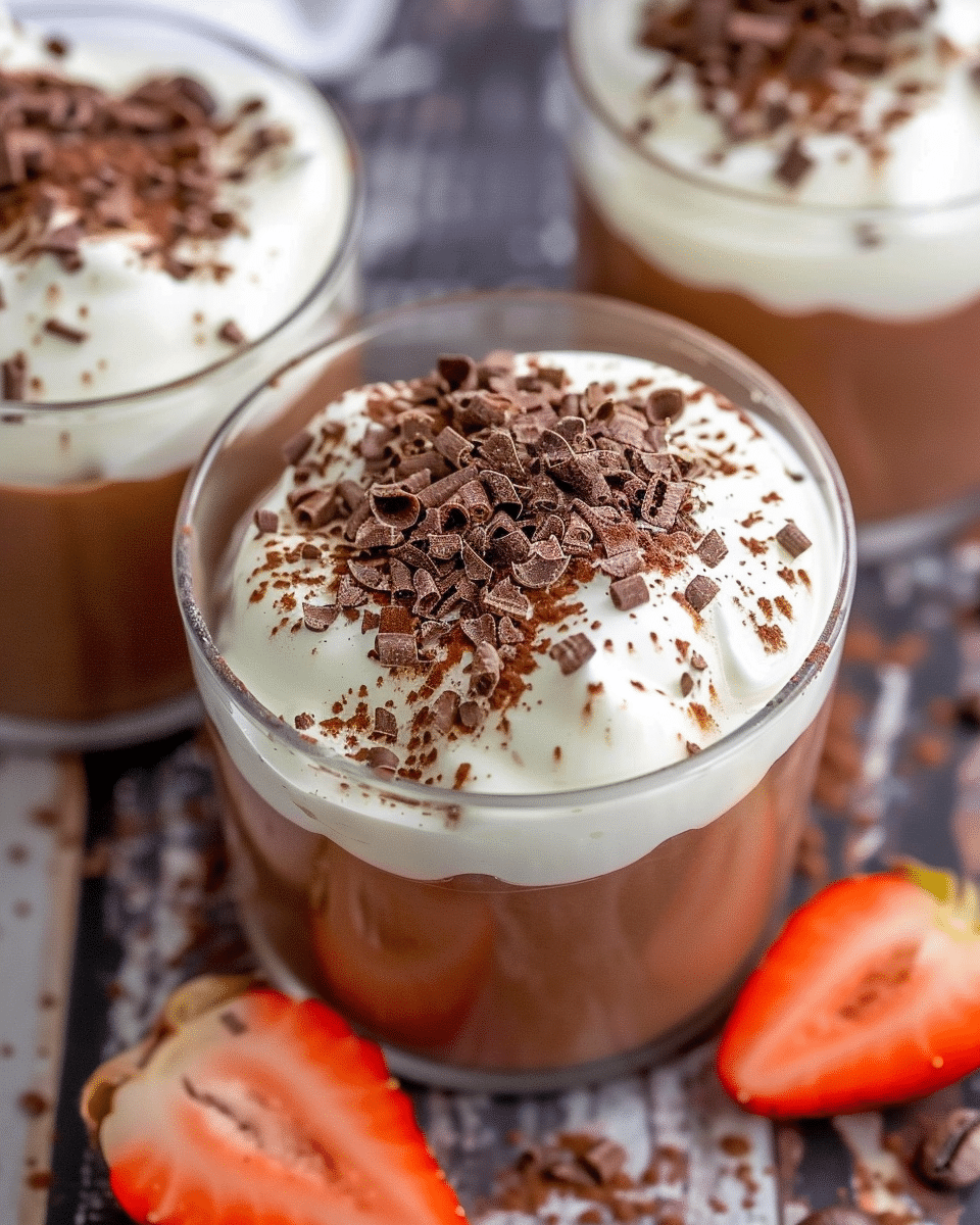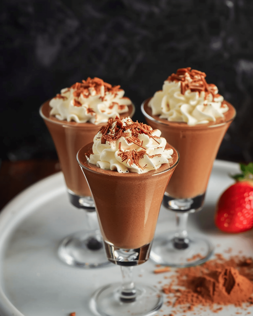 When ready to serve, top each mousse cup with a dollop of whipped cream and garnish with chocolate shavings or a dusting of cocoa powder. Serve cold.