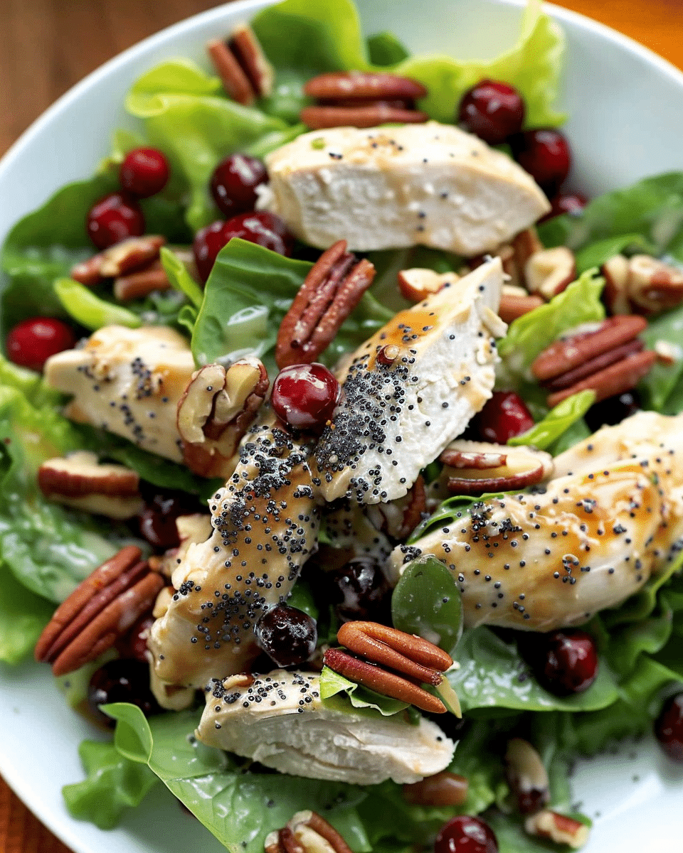 This is a bright, crunchy, and creamy chicken salad combining tender chicken, dried cranberries, toasted pecans, crisp greens, and a silky poppy seed dressing — ready in about 15 minutes.