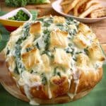 A warm, shareable sourdough loaf stuffed with creamy spinach, garlic, and melted cheese, baked until golden and bubbly for the perfect appetizer or cozy snack.