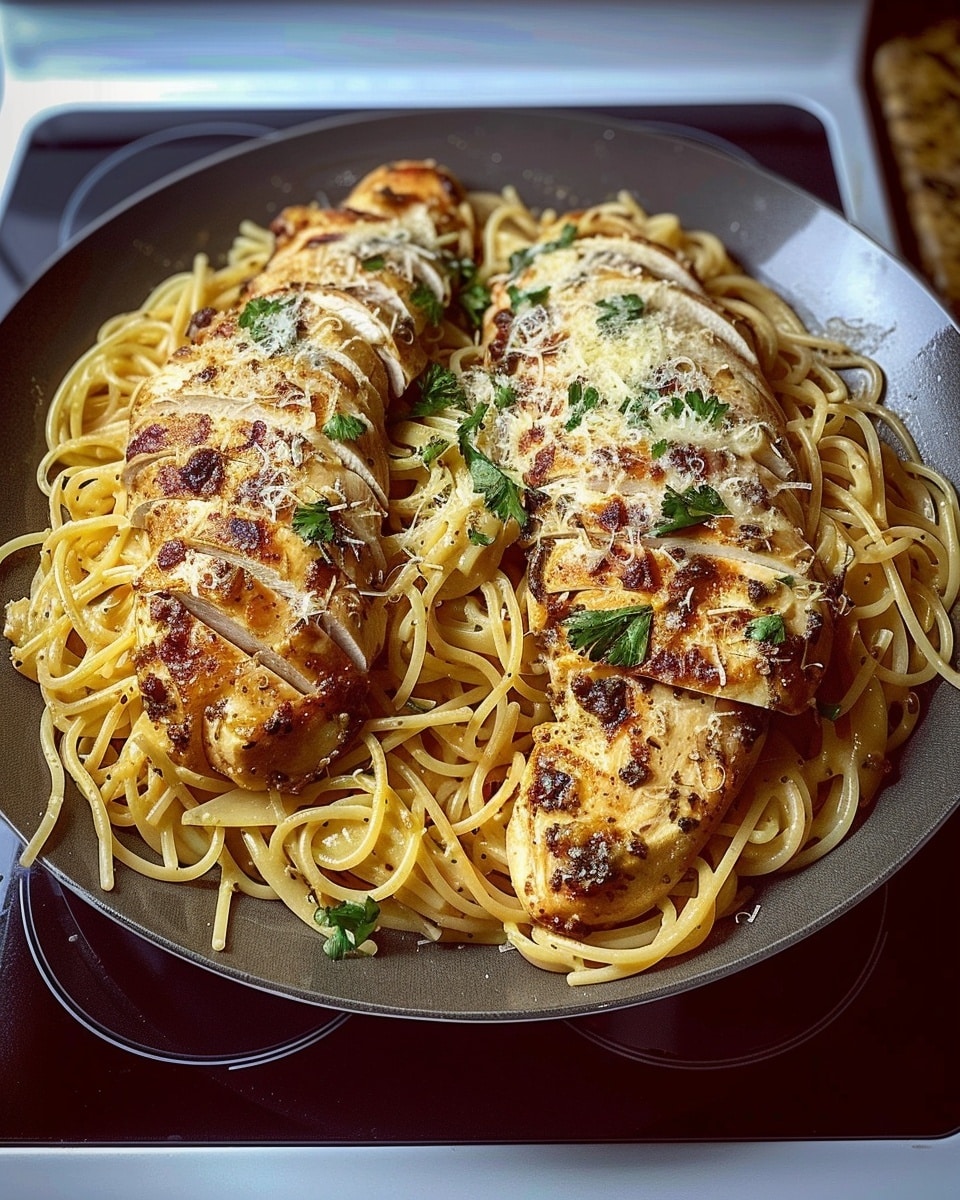 Return chicken to the skillet and add drained spaghetti. Toss until evenly coated.
