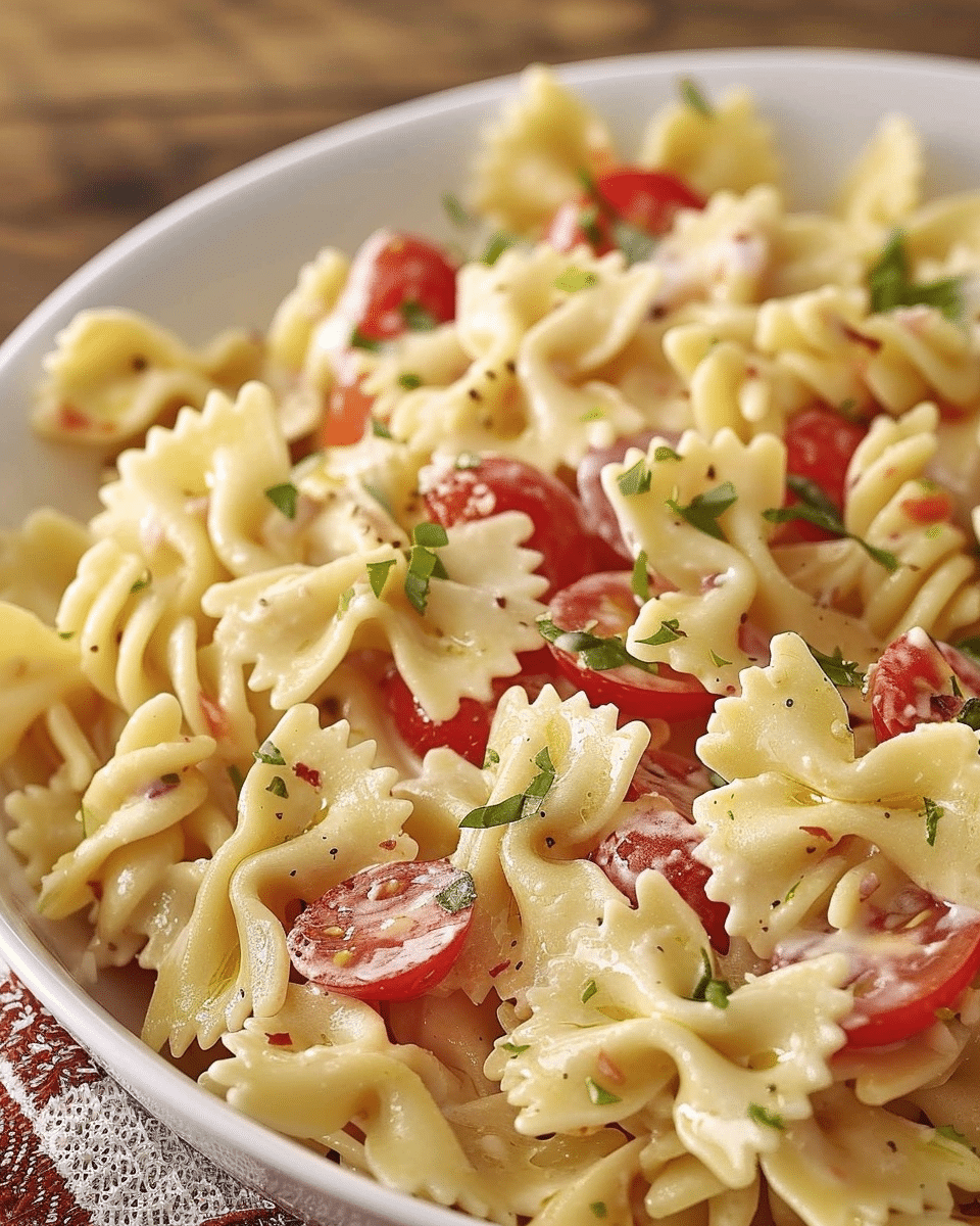 This recipe comes together quickly with simple, familiar ingredients. The creamy dressing adds comfort while the tomatoes and basil keep it light and fresh. It’s versatile, crowd-friendly, and can easily be customized with proteins or greens to suit your meal.