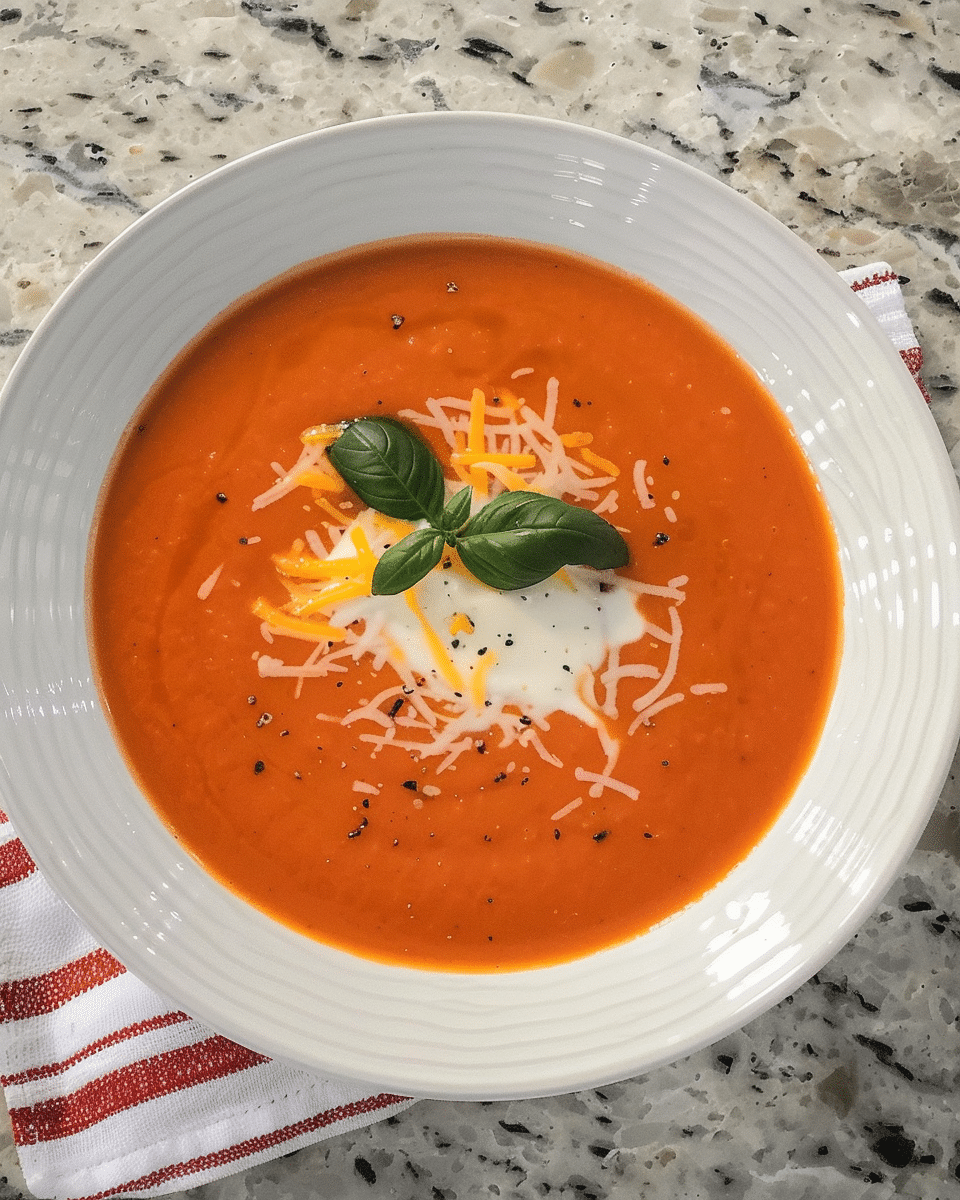 Finally, I ladle the soup into bowls and garnish with grated Parmesan and a few extra basil leaves if I want to dress it up.