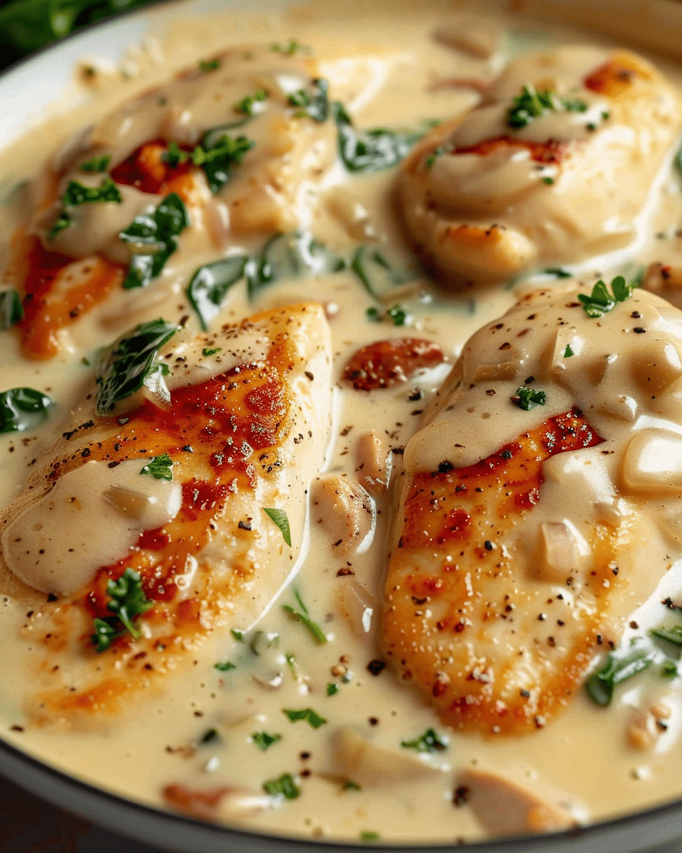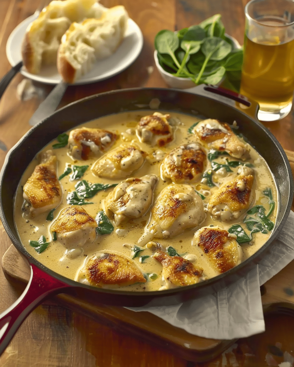 A cozy and creamy one-skillet chicken dish with a garlic-Parmesan sauce and fresh spinach. Quick, comforting, and perfect for busy weeknights or easy leftovers.