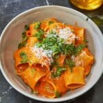 Bring a large pot of water to a boil. Generously salt the water and cook the rigatoni according to package instructions until al dente, about 10–12 minutes. Reserve ½ cup of pasta water before draining.