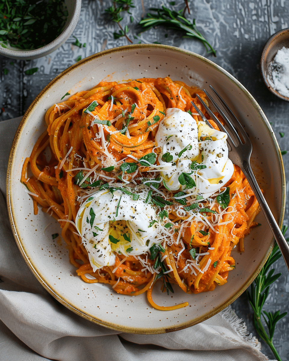 Creamy Red Pepper Pasta with Burrata & Herbs