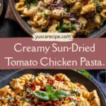 Creamy sun-dried tomato chicken pasta is a one-pot comfort meal featuring tender chicken, rigatoni pasta, sun-dried tomatoes, spinach, and a savory cream sauce with bold Tuscan-inspired flavor.