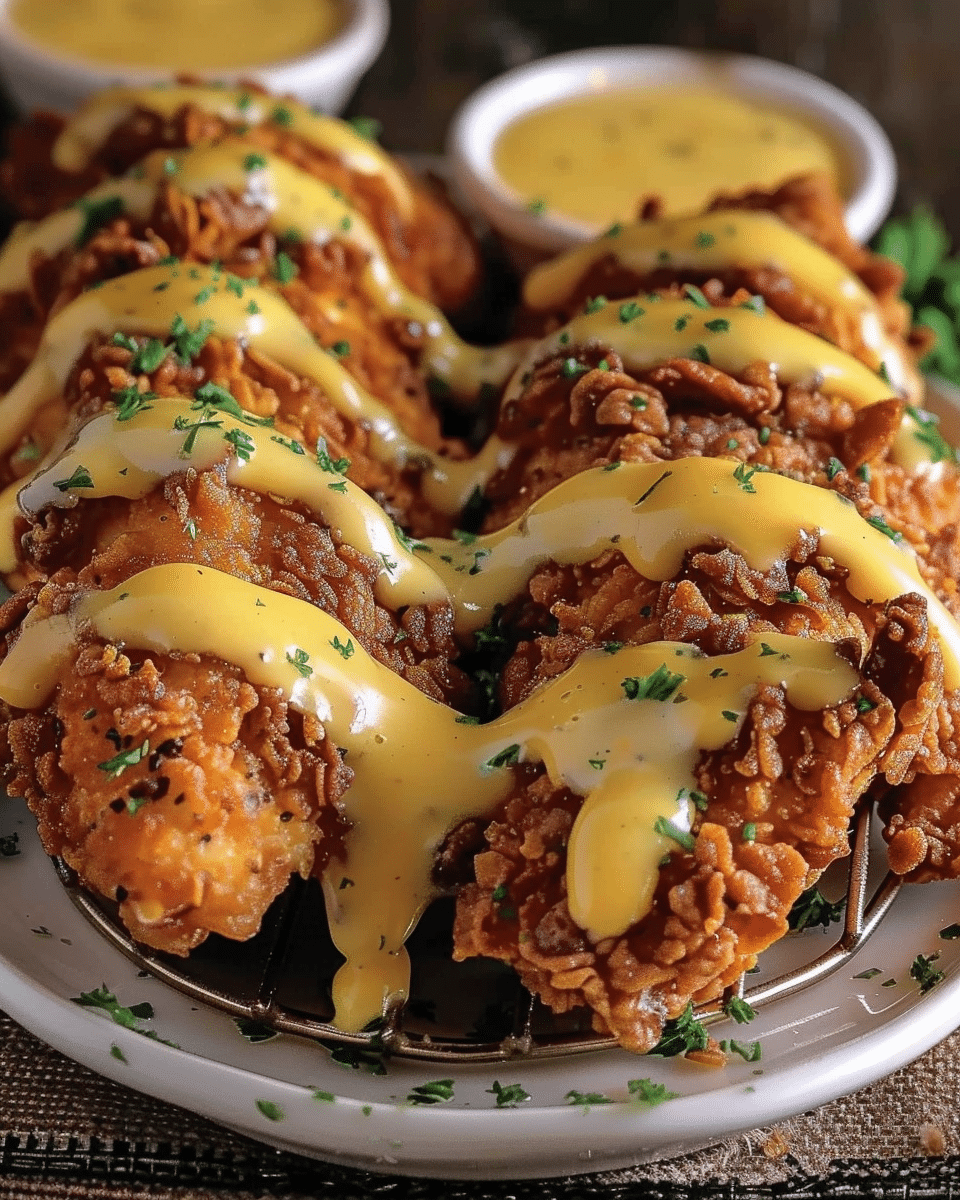 Serve the crispy chicken hot, generously drizzled with the mustard-cheddar sauce.