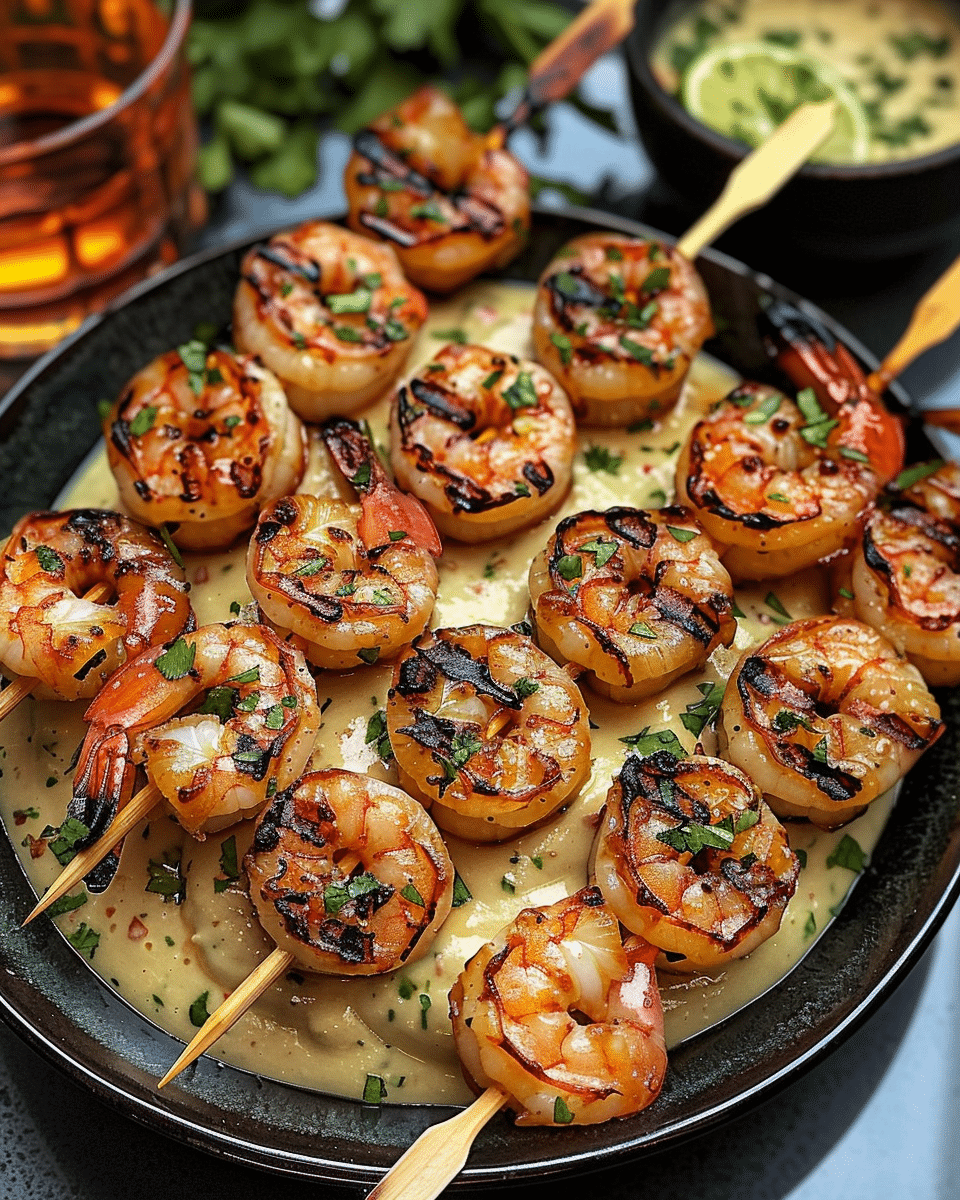 Arrange shrimp skewers on a serving platter. Serve with the tangy lime dip on the side.