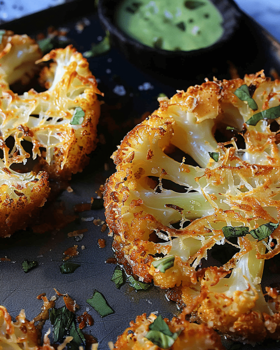 Crispy Parmesan Cauliflower Steaks are oven-roasted to golden perfection with a savory parmesan and spice crust. Served with a zesty avocado dip, they make a satisfying vegetarian main or a standout side dish.