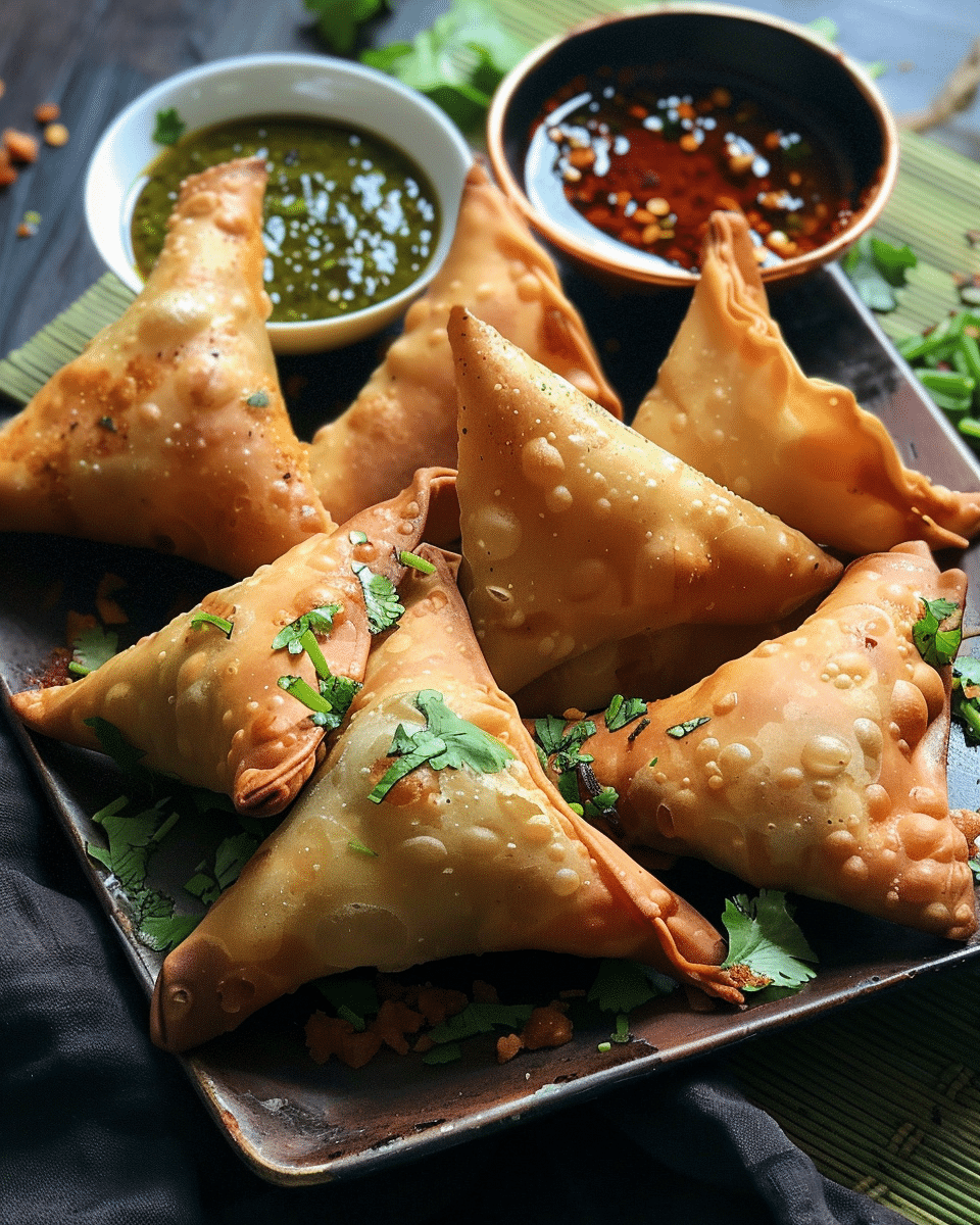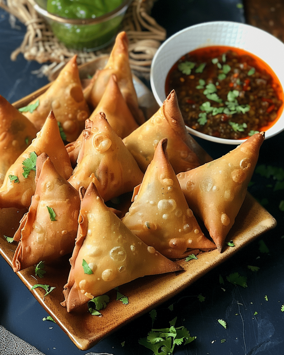 Crispy samosas are golden, triangular pastries filled with a spiced meat or vegetable mixture and served with a tangy-sweet homemade tamarind chutney. Perfect as an appetizer, snack, or party finger food, they combine crunch, flavor, and aroma in every bite.