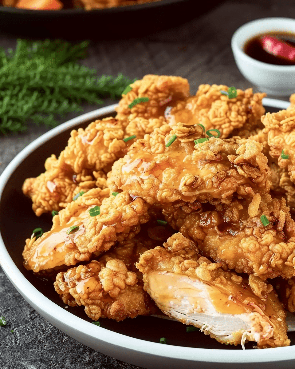 This is a mouth-watering dish of tender, boneless, skinless chicken breasts coated in a super-crispy double breading and finished with a luscious honey-garlic sauce. It delivers a fantastic contrast of crunchy exterior and juicy interior, with a sweet-savory glaze that makes it irresistible.