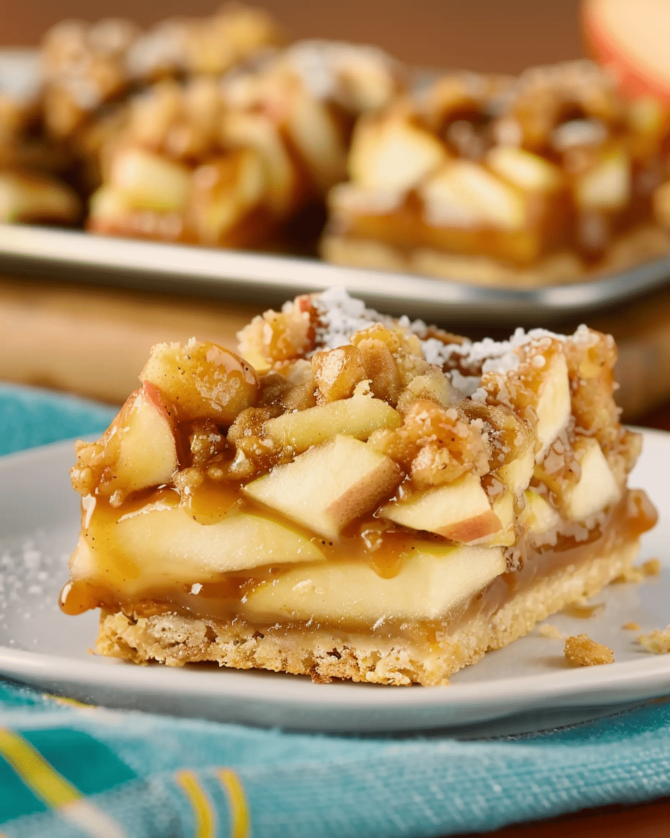 These Easy Caramel Apple Bars combine tender spiced apples, rich dulce de leche, and a buttery shortbread crust into a portable, sliceable dessert that captures all the flavor of a classic caramel apple — without the mess.