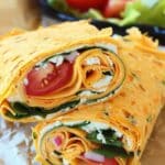 This wrap is best enjoyed fresh, but leftovers can be stored in an airtight container in the refrigerator for up to 2 days. Place a sheet of parchment between folds or layers to help prevent sticking.