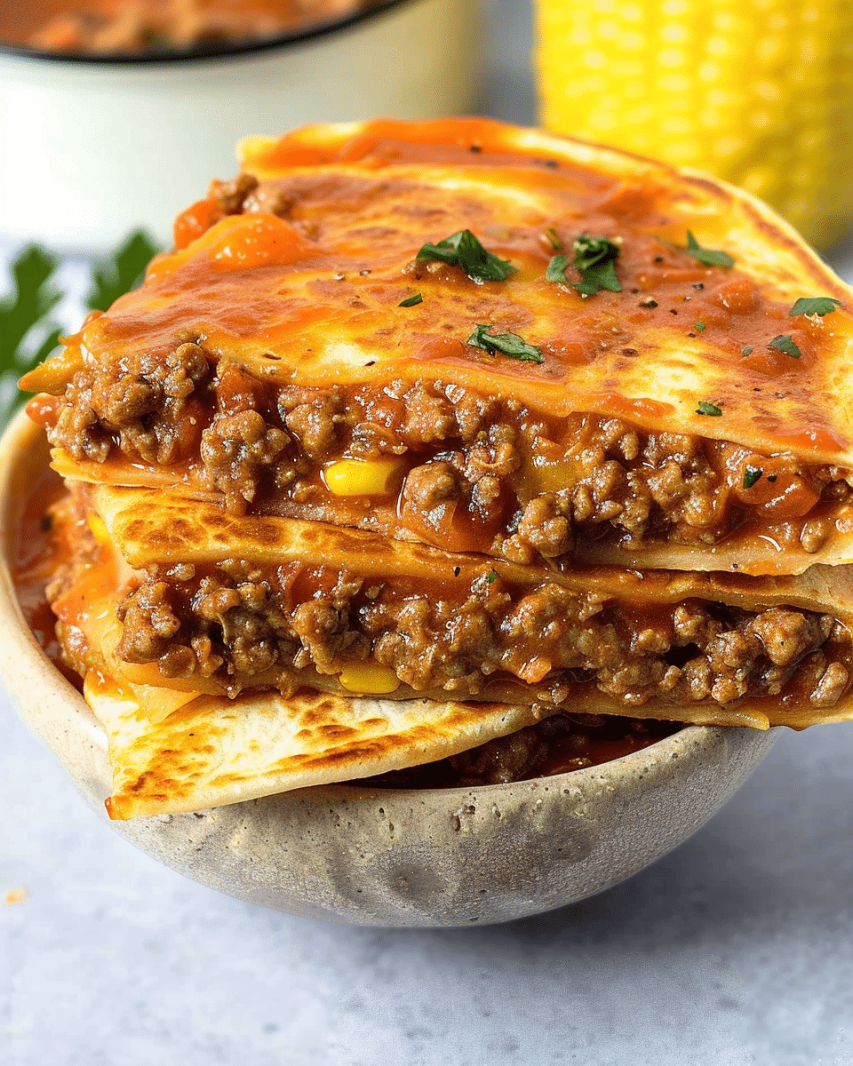 Place a tortilla in the hot skillet, sprinkle a portion of cheese over half the tortilla, then add a layer of the beef mixture. Top with a bit more cheese, then fold the tortilla in half to enclose the filling.