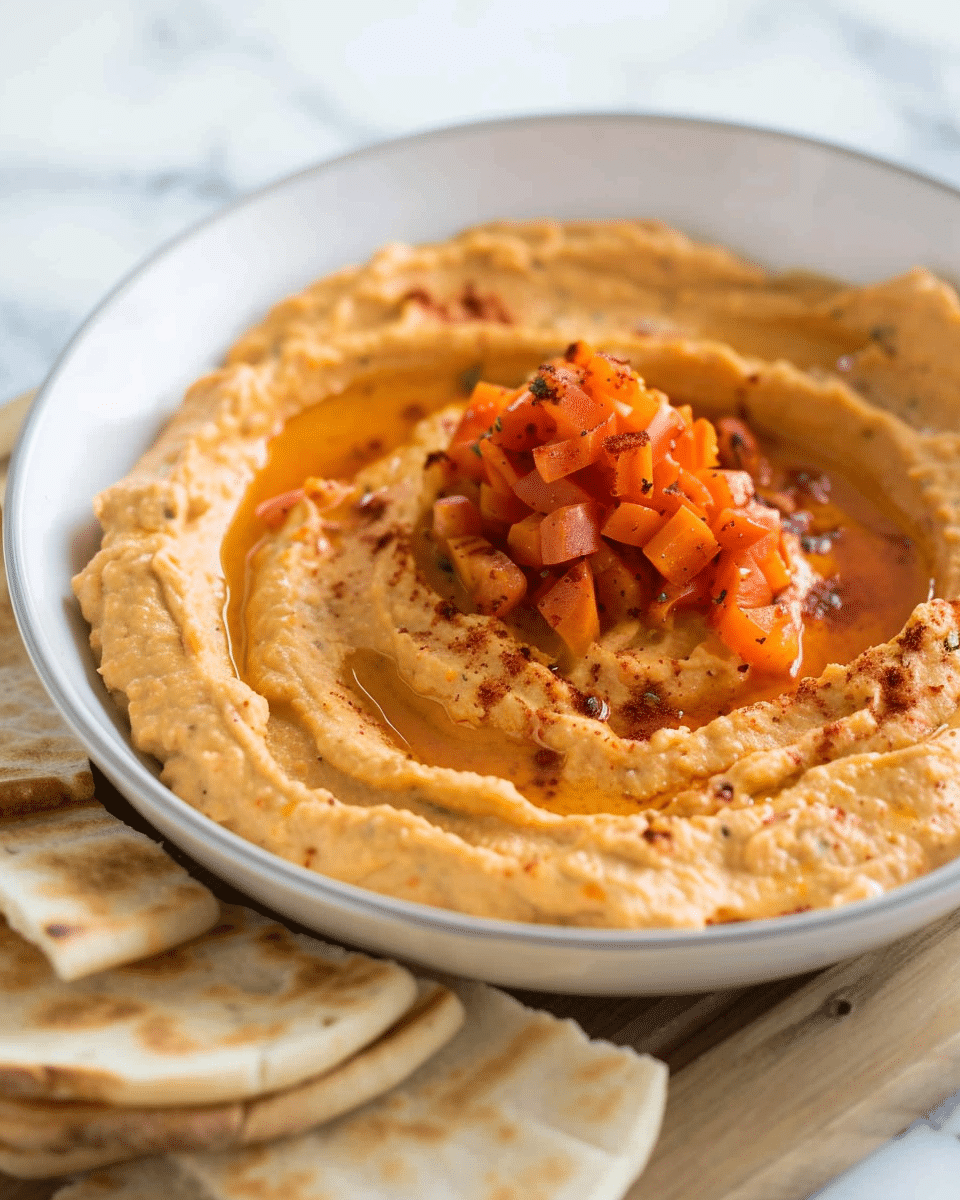 This roasted red pepper hummus is creamy, smoky, and fresh, made with roasted bell peppers, chickpeas, tahini, lemon, and olive oil. It’s a versatile dip or spread that comes together in under 40 minutes and tastes far better than store-bought hummus.